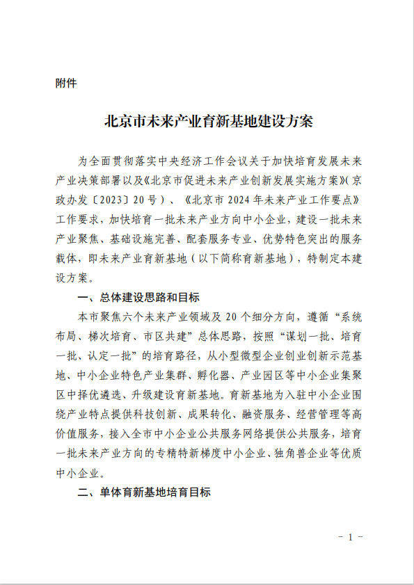 为全面贯彻落实中央经济工作会议关于加快培育发展未来产业决策部署以及《北京市促进未来产业创新发展实施方案》(京政办发〔2023〕20号)、《北京市2024年未来产业工作要点》工作要求,加快培育一批未来产业方向中小企业,建设一批未来产业聚焦、基础设施完善、配套服务专业、优势特色突出的未来产业育新基地,我局研究制定了《北京市未来产业育新基地建设方案》,现印发给你们,请结合实际贯彻落实。
