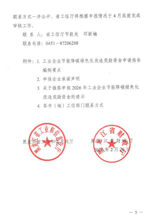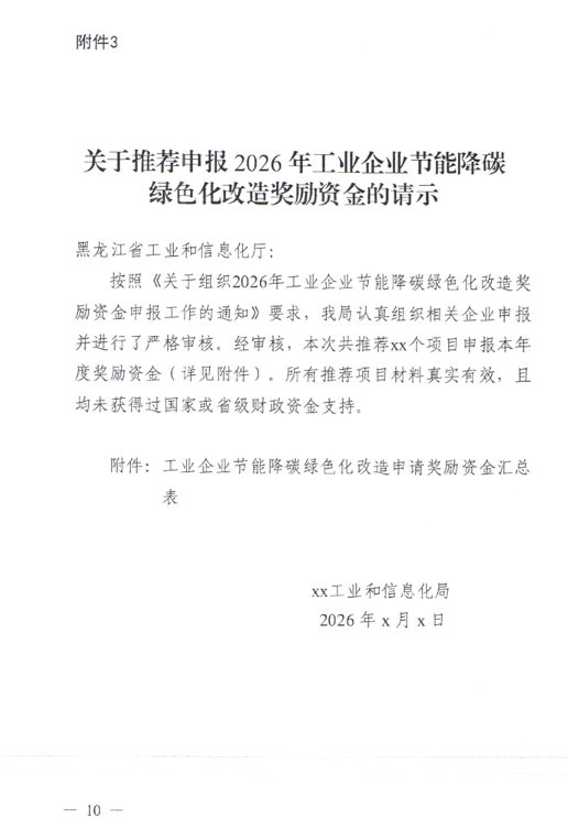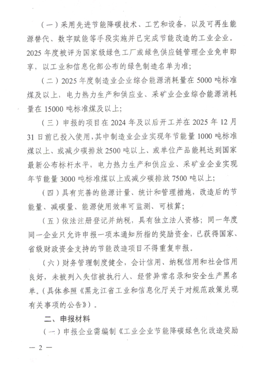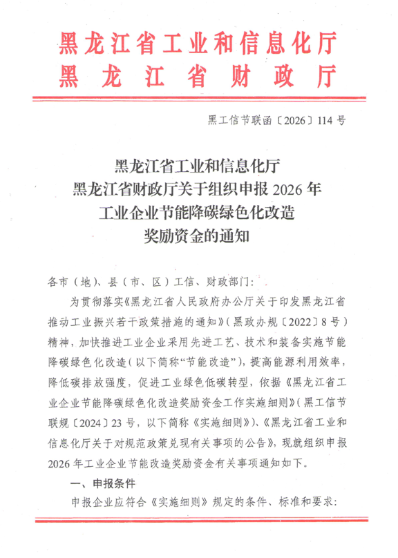 黑龙江:关于组织申报2026年工业企业节能降碳绿色化改造奖励资金的通知