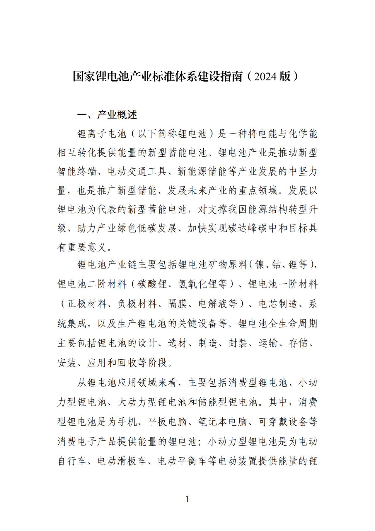 四部门:关于印发国家锂电池产业标准体系建设指南(2024版)的通知