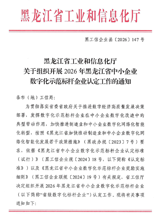 黑龙江:关于组织开展2026年黑龙江省中小企业数字化示范标杆企业认定工作的通知