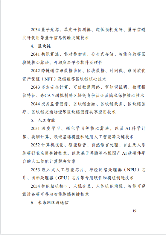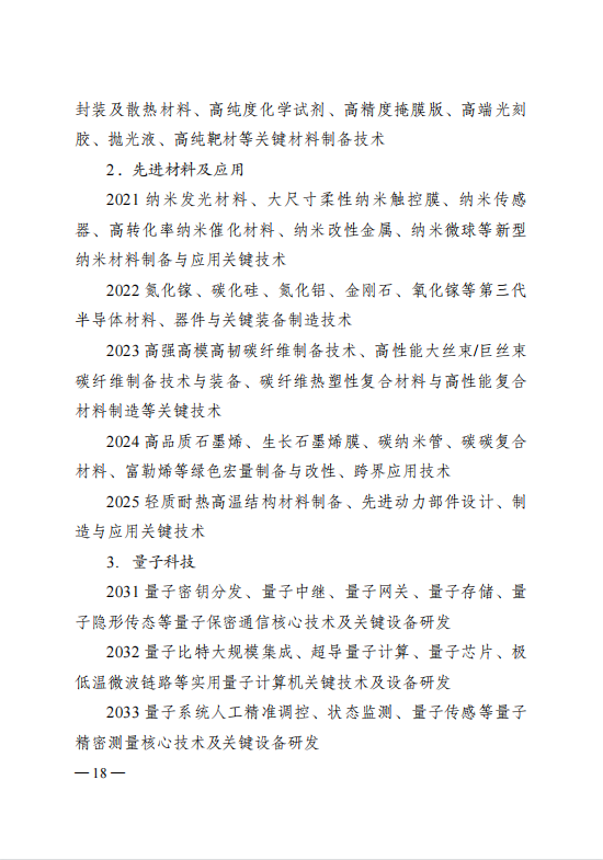 1.加强前沿战略技术部署。面向世界科技前沿和产业竞争 热点,加快新一代人工智能、量子科技、区块链等前瞻性技术 研发,力争率先取得突破,积极抢占产业技术竞争制高点。面 向国家重大战略需要,聚焦集成电路、先进制造、新材料等重 点领域,集中力量开展关键核心技术攻关和重要标准研发,加 快推进核心技术自主化,不断提升产业高端化发展水平。