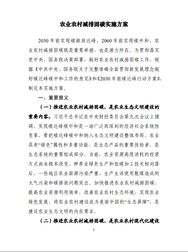 两部门:关于印发 《农业农村减排固碳实施方案》的通知