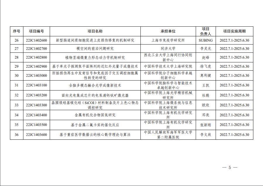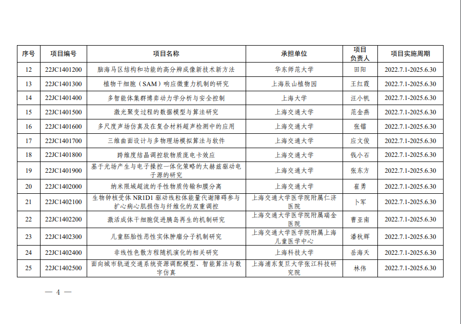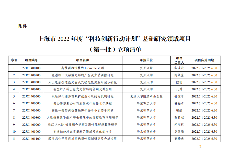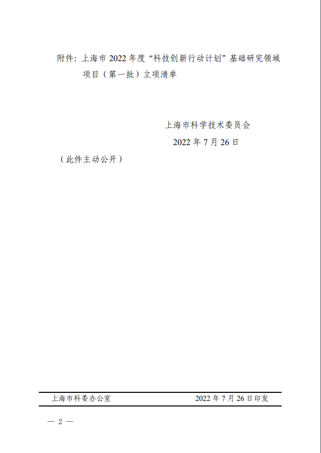 上海:关于上海市2022年度“科技创新行动计划”基础研究领域项目(第一批)立项的通知