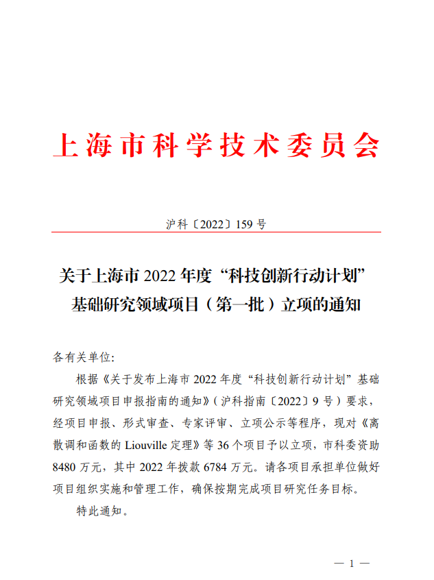 根据《关于发布上海市2022年度“科技创新行动计划”基础研究领域项目申报指南的通知》(沪科指南〔2022〕9号)要求,经项目申报、形式审查、专家评审、立项公示等程序,现对《离散调和函数的Liouville定理》等36个项目予以立项,市科委资助8480万元,其中2022年拨款6784万元。请各项目承担单位做好项目组织实施和管理工作,确保按期完成项目研究任务目标。