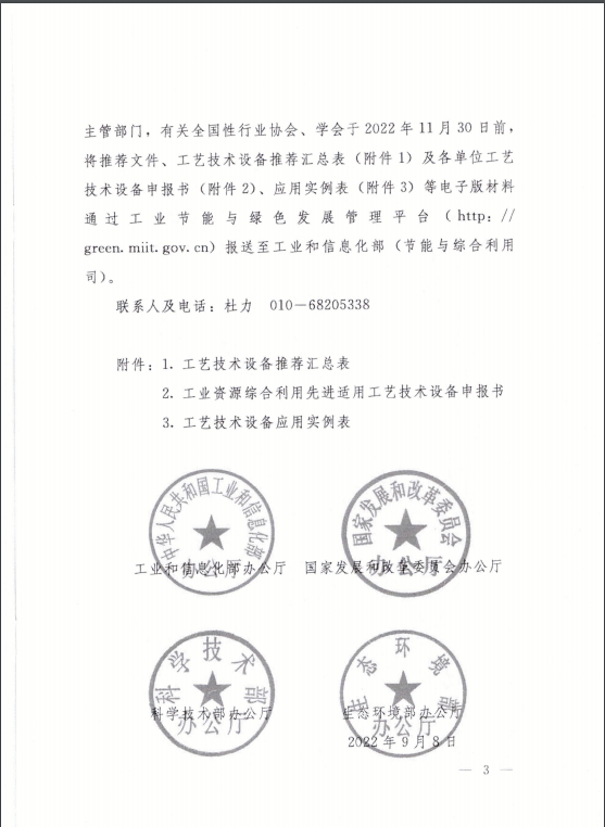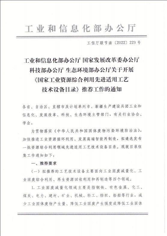 为贯彻落实《中华人民共和国固体废物污染环境防治法》,加快推进工业固废减量化资源化先进适用工艺技术设备推广应用,按照《工业和信息化部办公厅 国家发展改革委办公厅 科技部办公厅 生态环境部办公厅关于开展<国家工业资源综合利用先进适用工艺技术设备目录>推荐工作的通知》(工信厅联节〔2022〕229号)要求,现开展我市有关申报工作,请符合条件的单位按照附件中通知要求编写申报材料,于11月18日前报送材料文字版一式3份、电子版1份(U盘或光盘)。